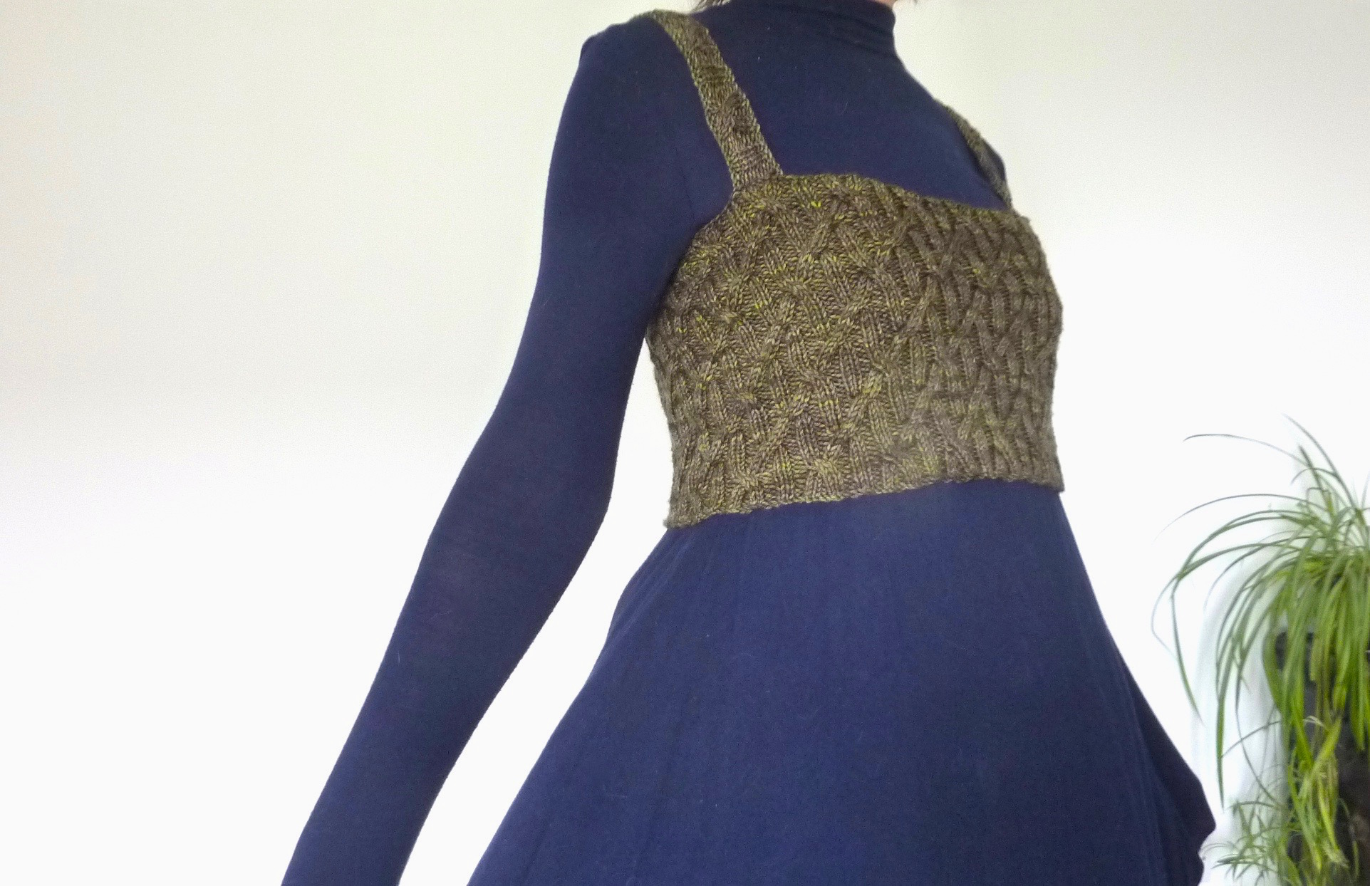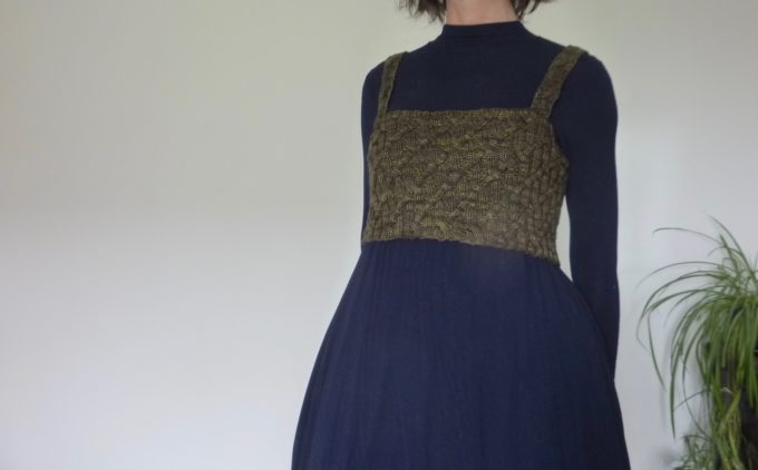 You knit the straps first and then work your Ancestors Bodice to the length you’d like {or the length your stash yarn amount allows!}. Choose cropped as a bralet style / empire line or knit a full corset-style longer length.